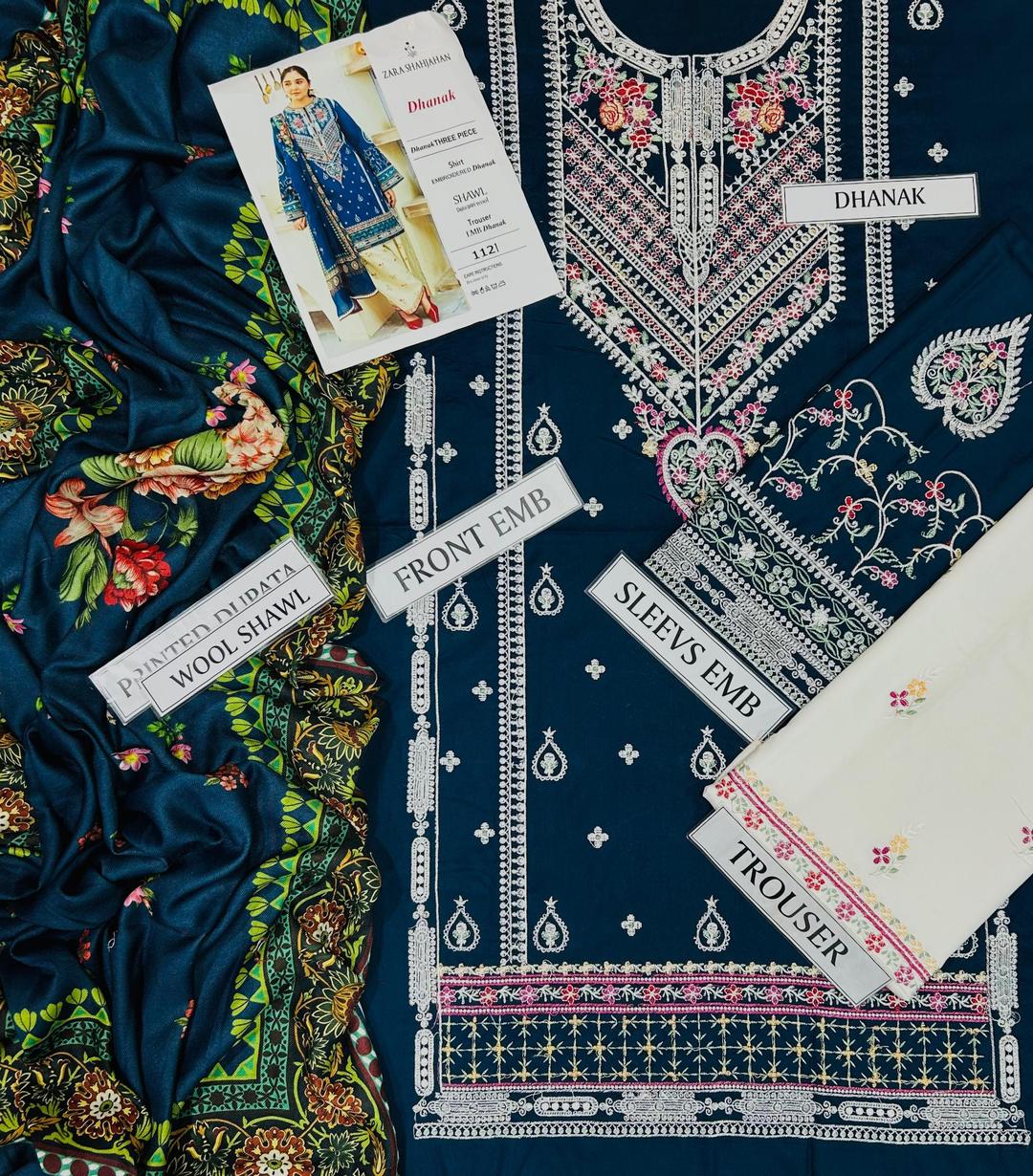 3 Pcs Women’s Unstitched Dhanak Embroidered Suit with Wool Shawl – Blue