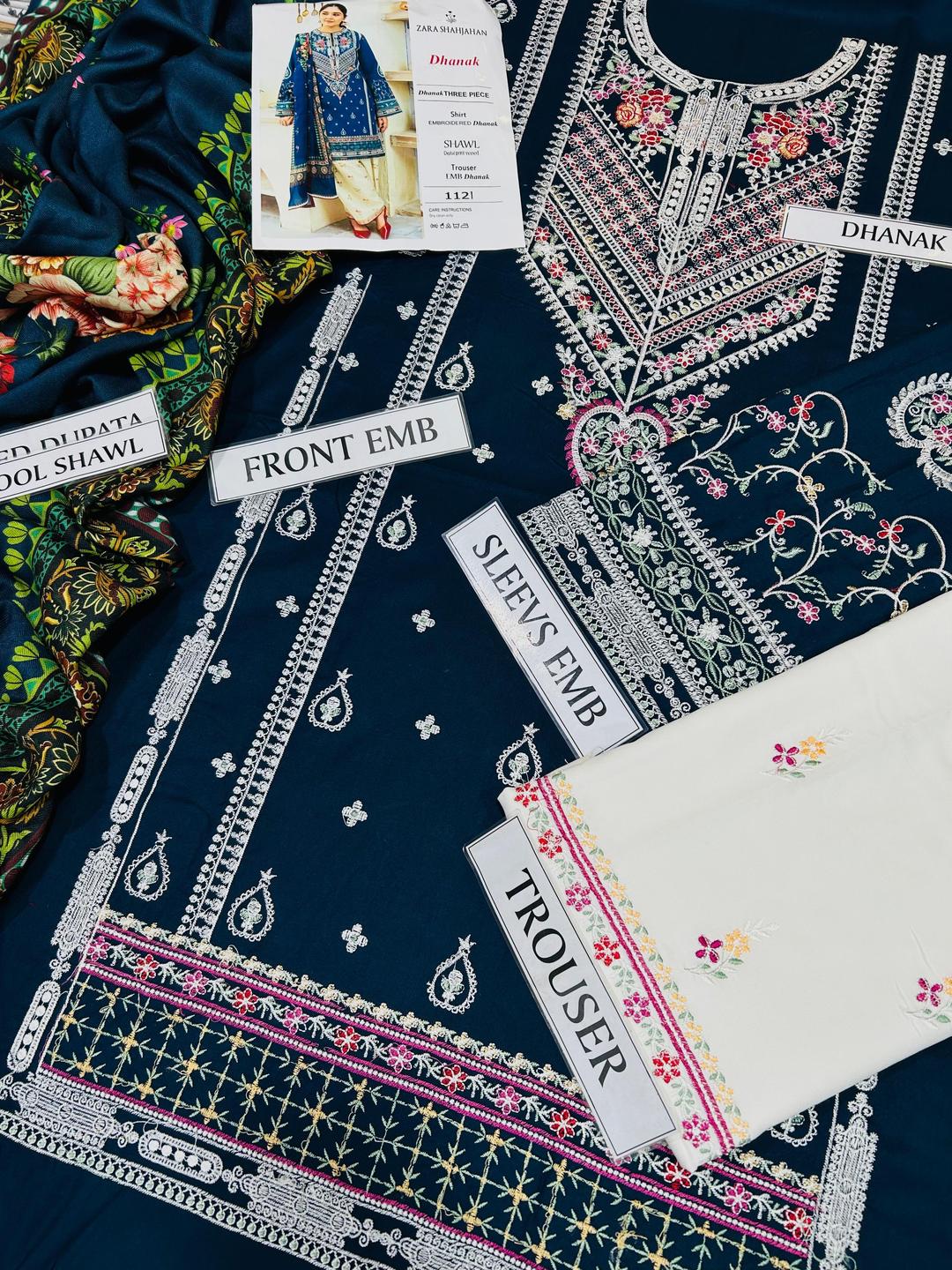 • Shirt Fabric: Dhanak• Pattern: Embroidered• Shirt Front Pattern: Embroidered• Sleeves Pattern: Embroidered• Trouser Fabric: Dhanak• Trouser Pattern: Embroidered• Dupatta Fabric: Wool• Dupatta Pattern: Digital Print• Number Of Pieces: 3 Pcs• Package Includes: 1 x Shirt, 1 x Trouser, 1 x Wool Shawl• Shirt Cutting: 3 Gazz• Trouser Cutting: 2.5 Gazz• Dupatta Cutting: 2.5 Gazz• Color: Blue• Note: There might be an error of 1-3 cm due to manual measurement, and slight color differences may occur as a result of varying lighting and monitor effects.• Product Code: MZ54900000712BAGGCN