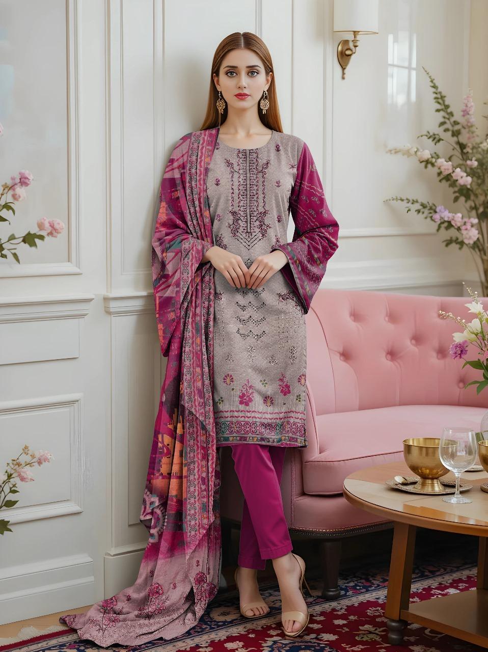 3 Pcs Women’s Unstitched Dobby Lawn Embroidered Suit with Printed Shirt & Embroidered Dupatta – Purple
