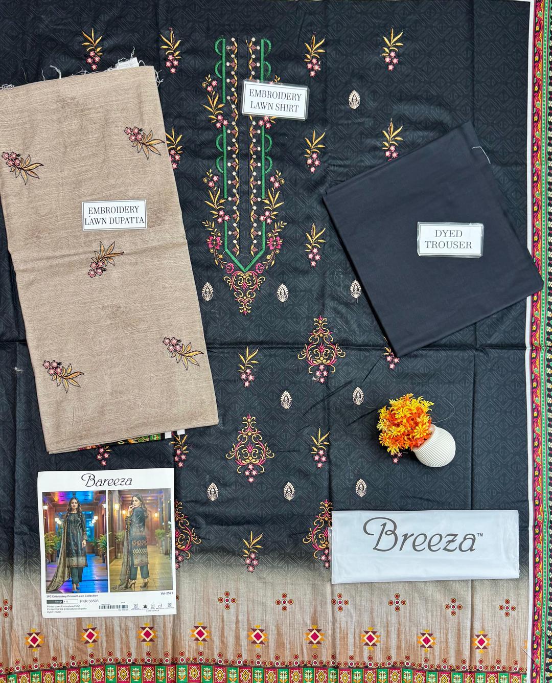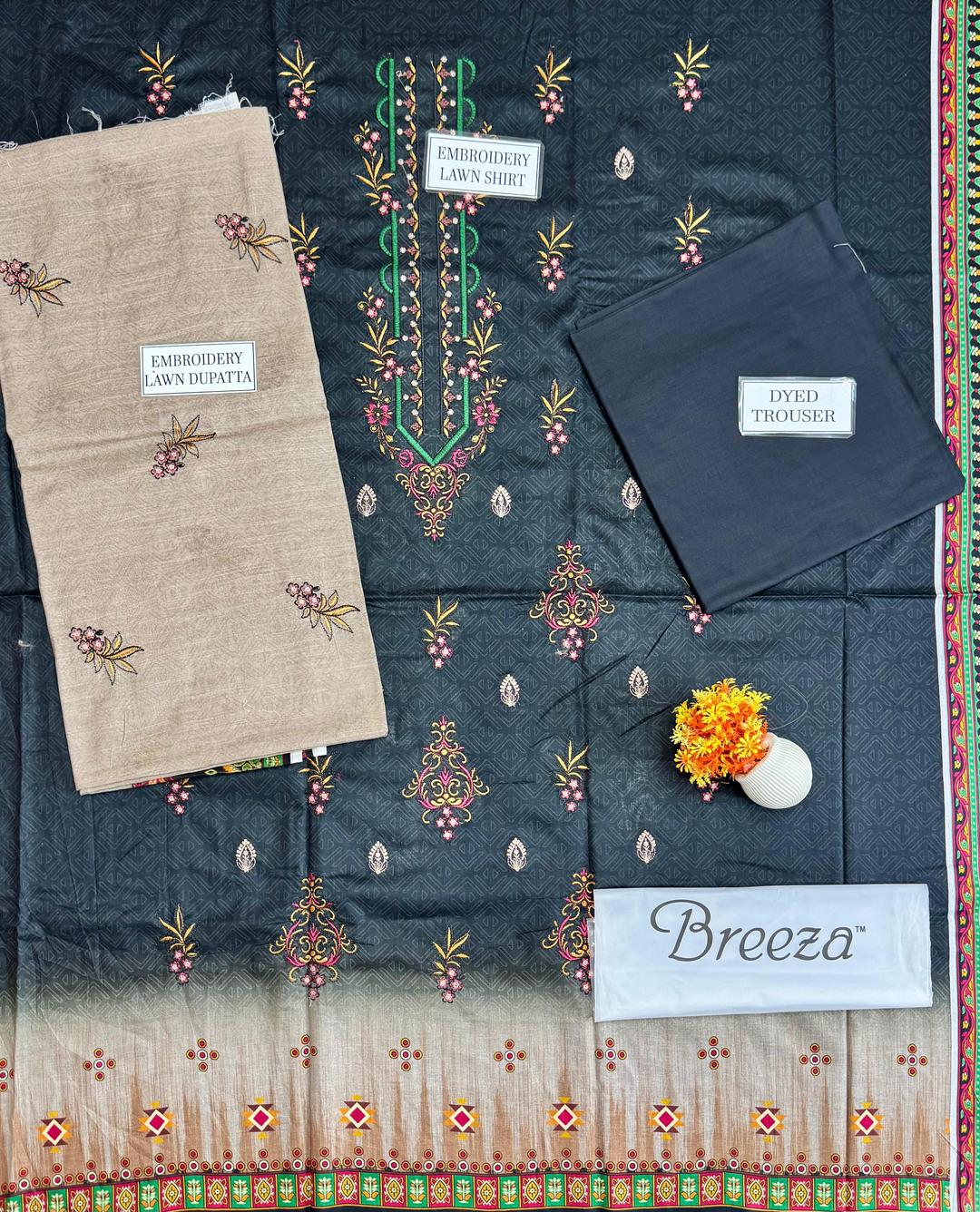 3 Pcs Women’s Unstitched Lawn Printed Suit with Embroidered Neckline & Silk Dupatta – Black